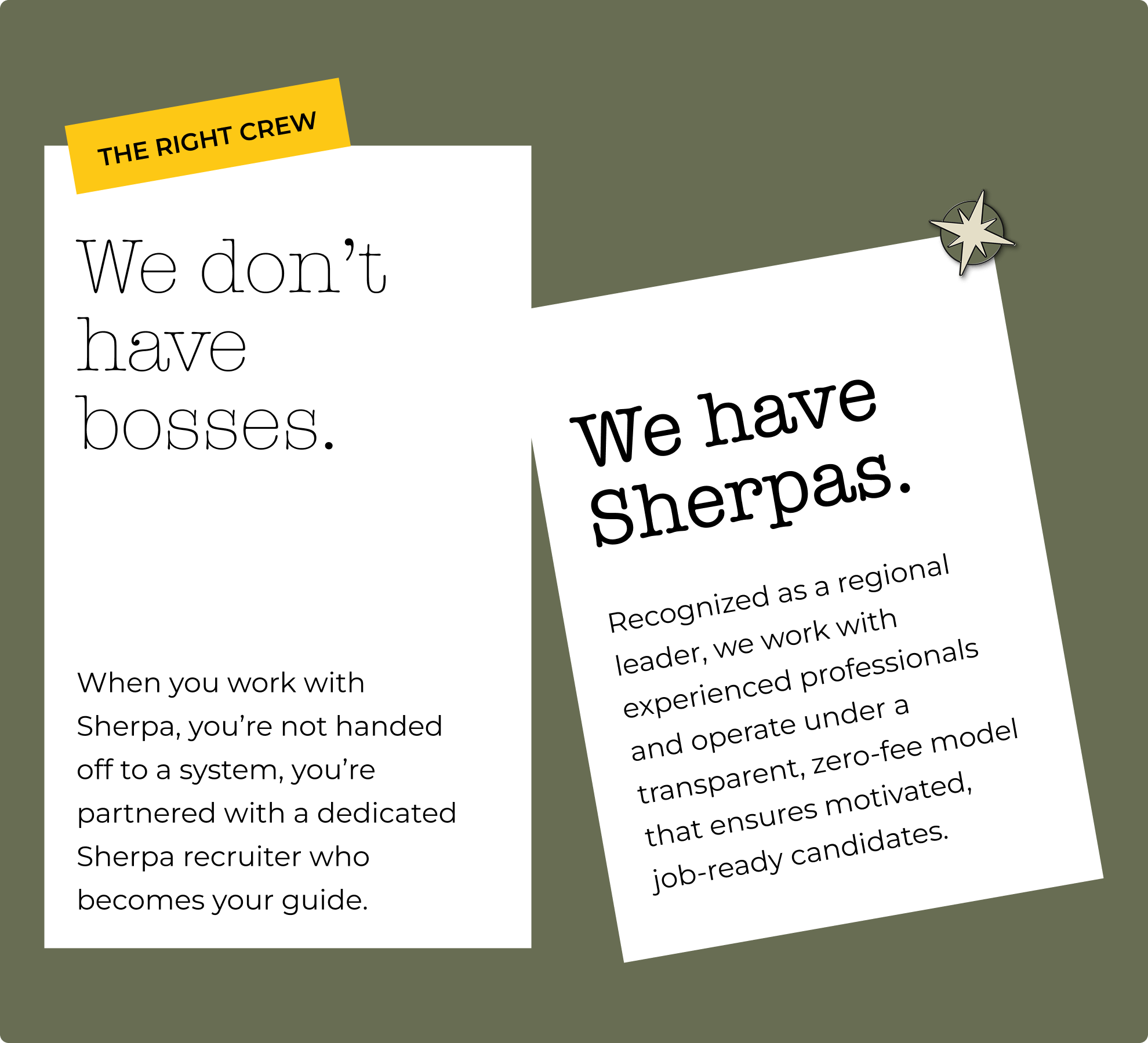 Just like the Sherpas of the Himalayas guide climbers to the world’s highest peaks, our Sherpa recruiters lead clients through the complex journey of workforce recruitment.